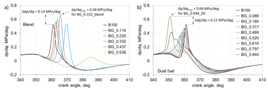 In Figure 5, the pressure rise rate (dp/dϕ) for analyzed cases are presented. For the co-combustion of fuels as a blend, with the increase in gasoline fraction, the peak value of dp/dϕ was obtained later due to lower average CN of the fuel mixture. In the case of the dual fuel mode, the peak values of pressure rise were obtained earlier. In both cases, the maximal values of (dp/dϕ) did not exceed the maximum value allowable for the compression ignition engine—1 MPa/deg [24,25].