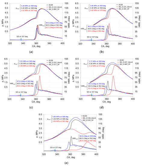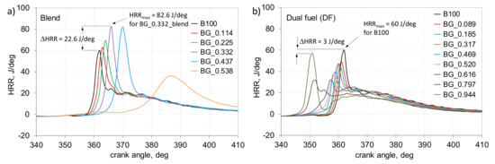 In Figure 6, the results of heat release analysis are presented. This parameter provides information about the rate of conversion of fuel energy to heat in the combustion chamber of the IC engine. In the case of blend combustion, it can be stated that with the increase in gasoline fraction, the maximum value of heat release rate (HRR) was obtained later with a higher value, which was due to an increase in ignition delay. In the case of dual fuel engine with the increase in gasoline fraction up to 0.60, the maximum value of HRR was obtained earlier with lower peak values. For near 0.80 of gasoline, the combustion process started rapidly with very small ignition delay (ID). Blend combustion shifts the peak HRR to higher degree of CA values after TDC, but in the case of DF, shifts in the opposite direction—to CA before TDC—in conditions of a constant angle of biodiesel injection.