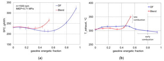 In Figure 8, a comparison of specific fuel consumption for both combustion systems is presented. It can be stated that for dual fuel technology with the increase in gasoline fraction the SFC decreased up to 0.62 of gasoline fraction. In the case of blend combustion, for all analyzed fuel fractions, SFC increased in comparison with dual fuel technology. Up to 0.30 of gasoline in an SFC blend was at the same level equal to 230 g/kWh. Exceeding 0.40 of gasoline in the SFC blend rapidly increased due to the significant deterioration of combustion. For the highest gasoline fraction in the blend, the combustion process was delayed. This was accompanied by an increase in exhaust gas temperature. For dual fuel technology, for a higher gasoline fraction value of exhaust gas, the temperature started to decrease due to the early combustion process.