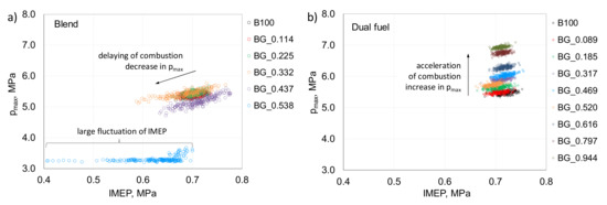 In Figure 11, the results of the relationship between IMEP and peak pressure for both analyzed cases are presented. It is visible that in the case of blend combustion, the spread of value of IMEP was relatively large—from nearly 0.2 MPa up to 0.40 of gasoline fraction. For the highest gasoline fraction (0.50), the spread of IMEP was stretched to over 0.3 MPa with peak pressure not exceeding 4 MPa. It was due to significant deterioration of the combustion process. In the case of dual fuel technology, for all analyzed gasoline fractions, we obtained high quality stability of the combustion process. The spread of IMEP was below 0.1 MPa and the decrease of peak pressure was due to the constant engine torque imposed during the tests.