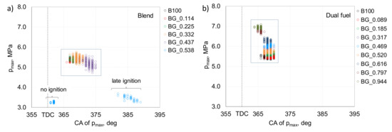 In Figure 12, the results of the investigation of peak pressure position after TDC are presented. It is visible that, in the case of blend combustion, the position of peak pressure was changed in the direction of large values of CA after TDC due to increase in the ignition delay. For a blend of 0.50 of gasoline, we noticed division into two areas—one with normal ignition and one with no ignition. For dual fuel technology, the peak pressure was obtained in a narrow range of crank angle (CA) degrees.