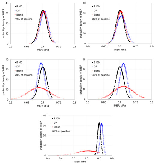 In Figure 13, the results of probability density of IMEP analysis are presented. It can be stated that with near to 0.10 of gasoline fraction in both combustion systems, the PD (probability density) of IMEP was near the same. From 0.30 of gasoline fraction in the combustion process, extending of the IMEP spread is possible. For 30% and 40% of gasoline fraction, the maximal value of IMEP was obtained in 12%–13% of the whole range. For 0.50 of gasoline, the spread of IMEP already exceeded the acceptable range of variation.