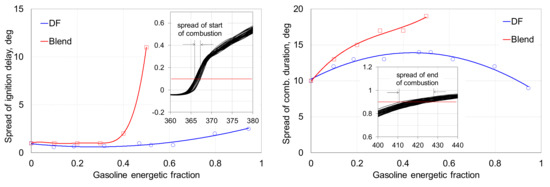 In Figure 16, results of comparative analysis of HC and NOx emission are presented. HC is one of the main pollutants produced from incomplete combustion which enters into the air with the other combustion products [40]. It can be stated that in the case of blend and DF combustion, up to 0.30 of the energetic fraction of gasoline obtained lower HC emissions. This can be explained by the increase in combustion efficiency and, as presented in Figure 17, the spread of start of ignition was very small. Another cause could be accredited to the reduction in the viscosity by adding gasoline that enhanced the spray characteristics and therefore improved the combustion process [41]. After exceeding this share of gasoline, in the case of blend, HC emission was increased which can be connected with lower combustion efficiency. Generally, the increase in the share of gasoline fraction in the combustion process was accompanied by an increase in NOx emissions. In the case of DF technology with a 0.95 share of gasoline, a 100% increase in NOx emissions was noted.