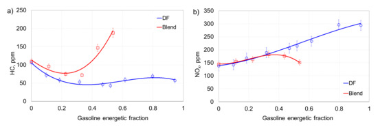 Emission of unburned hydrocarbons (HC) (a) and nitrogen oxides (NOx) (b).