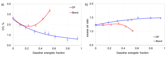 The carbon monoxide (CO) emission is the result of incomplete fuel combustion. This may be due to lower oxygen concentration and in-cylinder temperature in the vicinity of carbon molecule for complete conversion of CO to CO2. It can be stated that for dual fuel mode with the increase in gasoline fraction, CO emissions decreased, and simultaneously the combustion efficiency increased. For burning of the reference fuel, the CO emission was equal to 2.7% and for 0.95 of gasoline fraction it decreased to 0.67%—a decrease of more than four times. We analyzed emissions of CO for blend combustion—for gasoline fraction lower than 0.4 energetic fraction, the CO emission decreased, but slower than for DF mode. After exceeding this threshold, this emission increased rapidly. For 0.44 gasoline energetic fraction, the emission of CO was at the same level as for biodiesel combustion. In Figure 17, the results of excess air ratio investigation are also presented. In the case of excess air ratio analysis, it can be stated that for DF technology, this parameter slightly increased. These are the results obtained by measuring the air and fuel consumption. The trend of changes in the excess air coefficient with the increase of gasoline share can be combined with the course of SFC changes. In the case of DF technology with the increase in gasoline fraction, the SFC decreased and thus the content of oxygen in the exhaust gas increased. The reverse phenomenon was observed for the combustion of the blend.