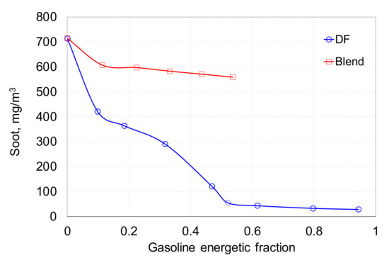 Figure 18 shows the soot emission characteristics of biodiesel/gasoline combustion using blend or dual fuel technology. The smoke emissions are hazardous emissions from compression ignition engines and are formed in locally fuel-rich, moderate-temperature regions when fuel breakdown occurs in the presence of insufficient oxygen. The soot emissions include the particles of partially burnt fuel, lubricating oil and solid phase suspended particles. It was concluded that dual fuel technology significantly reduces soot emissions in comparison with blend combustion. When running with pure biodiesel, the highest soot emissions were obtained and they were equal to 715 mg/m3. For both combustion modes with about 50% of gasoline fraction, the DF technology causes eight times lower soot emission in comparison with blend combustion. Already, at about 10% of the energy share of gasoline, the dual fuel method reduced soot emissions by 40% and the blend method by only 15%. In the case of blend combustion, a further increase in the share of gasoline does not significantly affect soot emissions. The dual fuel method of biodiesel/gasoline combustion is a more effective method for soot eliminating. This is due to the fact that most of the combustion process is a premix combustion instead of a diffusion combustion, thus avoiding soot formation.