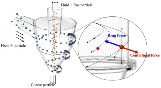 In order to solve the local optimization problem and computing cost problem, the method combining CFD and surrogate modeling has been applied for the relationship between cyclone shapes and separation performance [11,12,13,14,15,16]. For example, the surrogate models such as artificial neural network (ANN), response surface methodology (RSM) and group method of data handling (GMDH) algorithm showed the reasonable predictive performance, and optimum design was performed by applying optimization algorithms such as genetic algorithms (GA) [13]. However, the most optimization studies omitted the analysis of the cause of the optimal separation performance. For analyzing the optimization results, the tangential velocity contour, and the velocity distribution before and after optimization was compared based on the particle separation theory from Euler’s point of view [13,14]. However, since the force acting on the particles differs according to the rotational trajectory, it is more appropriate to analyze it according to the trajectory position rather than to analyze it from the Euler perspective. In other words, it is necessary to analyze the force acting according to the particle trajectory in the cyclone from the Lagrangian perspective. By analyzing the cyclone separation performance from the Lagrangian point of view, the verified cyclone separation performance parameter can be newly considered as a dependent variable of the cyclone design.