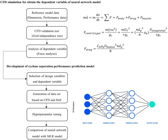 The flow chart of this study is summarized as shown in Figure 2. First, the characteristics of cyclones analyzed from the Lagrangian perspective in order to obtain meaningful dependent variables. Next, a CFD data set about the dependent variables is generated to develop a machine learning model. The data sets are created by a design space with various combinations using the design of experiment (DoE) method. Then, the machine learning model for cyclone separation performance are developed by the CFD data set. Finally, the developed model evaluates the predictive performance compared to the traditional surrogate model, MLR.