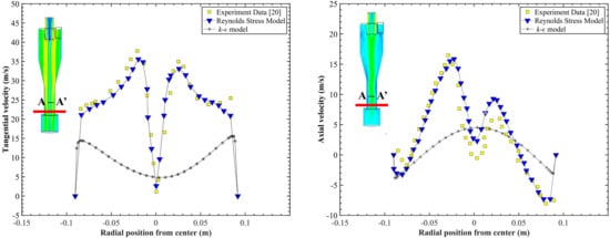 In addition, in order to select an appropriate turbulence model that can simulate a cyclone strong rotational flow, the results of the velocity distribution experiment [20] and the prediction results according to the turbulence model were compared. The experimental data and simulation data were compared with the results of the tangential velocity and axial velocity distribution at the certain locations (Y = 0.77D, ) as shown Figure 6. The residual values of the turbulence equation and mass equation showed the under and . In the Figure 6, the x label is the distance from the center of the cyclone to the wall. When the model was used, it showed an abnormal tangential distribution near the wall. The reason for this prediction is that the model assumes anisotropic property for modeling the Reynolds stress term. When model is applied for cyclone flow analysis, the outer flow and inner flow can be captured incorrectly. In contrast, Reynolds stress model (RSM) predicted a velocity distribution similar to the experimental results. The RSM can properly simulate rotational flow through an isotropic assumption for Reynolds stress term. Therefore, in this study, the RSM was applied to capture the cyclone flow. The detailed equations and explanations on the RSM can refer the reference [17,18].