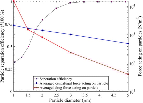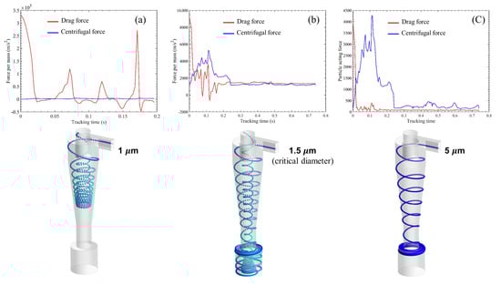 As shown Figure 7, In the case of 1 μm particles, the drag acting on the particles is superior to the centrifugal force, so the particles enter the inner flow region and are discharged through the cyclone outlet. In the case of 1.5 μm, the centrifugal force and drag act similarly, resulting in rotational motion within the cyclone. Eventually, the drag force is slightly larger and the particles are rebound in the dust container. The 5 μm particles have a larger centrifugal force than the drag force, so that the particles are collected in the dust container.