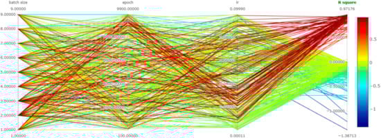 The neural network method was applied to develop the cyclone critical diameter prediction model. The predictive performance of a neural network algorithm depends on the learning parameters. In order to develop the optimal prediction model, the optimal learning parameters should be obtained. The leaning parameters are Epoch, batch size, and learning rate. The epoch is the number of back propagation process. The batch size is the number of data used for backpropagation process. The learning rate refers to the amount to learn when updating the model’s weights. The hyperparameter tuning was performed with random sampling method to derive parameters that affect the prediction model. The number of sampling was set to 500 in order to consider diversity of design space. The result of parameter optimization is shown in the Figure 9. The Figure 9 shows the results predicted by a random combination of learning parameters. The right end of the Figure 9 is a quantification of prediction performance according to parameter combinations. The R square and mean normalized error were used as indicators for quantitative evaluation of the model. R square represents the degree of agreement between the true value and the predicted value, and the closer to 1, the higher the performance. The mean normalizes error (MNE) is an index that can objectively evaluate the model’s performance. The optimal parameter combinations are summarized in the Table 6.