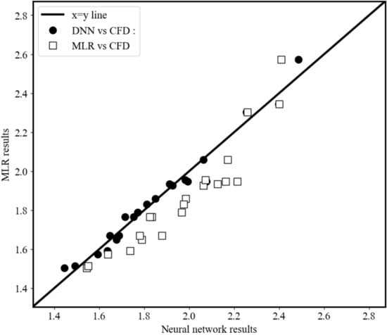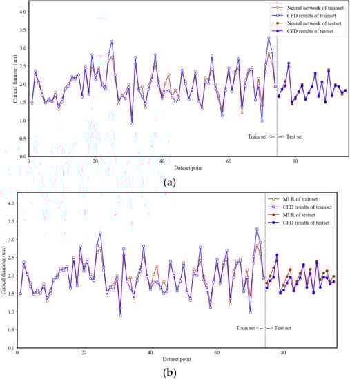 The model was developed using the train set based on the optimal learning parameter combination, and the performance of the neural network model was evaluated using the test set. To evaluate the predictive performance of the neural network model, the results of multi linear regression as reprehensively traditional surrogate model were compared. The result of comparing the prediction performance of the multi linear regression (MLR) model and the neural network model was shown in the Figure 10. Unlike the MLR model, since the neural network model can create a complex nonlinear relationship between the cyclone design variable and the critical diameter, it shows better predictive performance than the traditional method. The results of expressing this quantitatively are shown in the Table 7. The Neural network (NN) results increased about 32.2% and 27.6% in R2 and MNE, respectively, compared to MLR. This shows very good prediction performance. Figure 11 represents the training results and prediction results by the NN and MLR, respectively.
