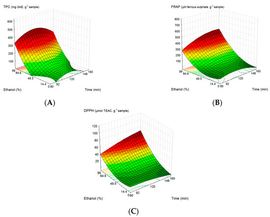 Response surfaces plots showing the effect of time and ethanol concentration on total phenolic content (TPC) and antioxidant capacity (FRAP and DPPH) represented by (A), (B) and (C), respectively.
