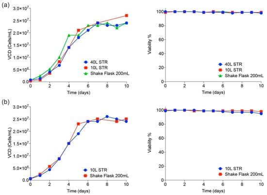 Cell culture scale-up performance in shake flasks and bioreactors. Viable cell densities (cells/mL) and viability (%) are shown at various scales of operation for both trimeric spike (a) and RBD (b).