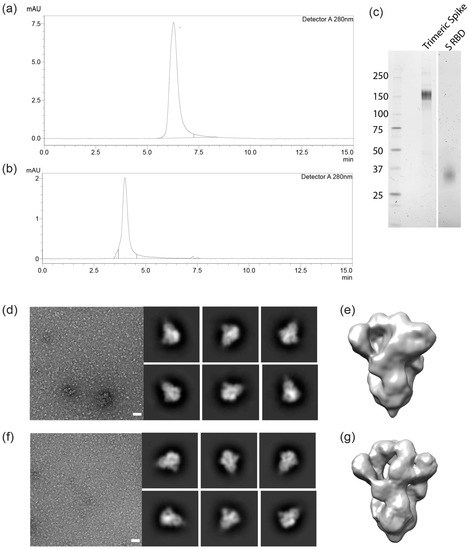 Trimeric spike and RBD from cell-free culture supernatant were purified using an immobilized metal affinity chromatography (IMAC) capture step followed by preparative size exclusion. Eluates were concentrated and formulated at 1 mg/mL in phophate-buffered salt solution, H 7.4. Purity of the final products was estimated to be over 95% as analyzed by HPLC-SEC (Figure 3a,b).