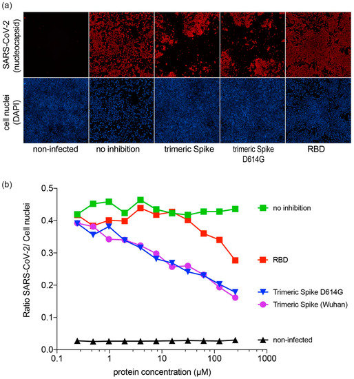 Briefly, SARS-CoV-2 virus (MOI of 0.01) was mixed with cell culture medium containing two-fold serial dilutions of RBD or trimeric spike, ranging in concentration from 240 to 0.244 µM. This mixture was inoculated onto Vero E6 cells and at 48 h post infection, SARS-CoV-2 infection was visualized using virus nucleocapsid antigen-specific staining (red) and by a cell nucleus-specific staining (blue), as described in [20]. Quantification of fluorescence was done as previously described [21].