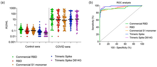A bead-based serological assay [22] was used. Patient sera were collected and reacted with commercially available RBD and monomeric S1 domain protein, as well as trimeric spike and RBD. Briefly, 11 µg of RBD (Sino Biologics, Bejing, China, Cat. No. 40592-V08H), RBD (ExcellGene), monomeric spike S1 (Sino Biologics, Bejing, China, Cat. No. 40591-V08H), or trimeric spike (ExcellGene), were loaded on 100 µL of Microplex fluorescent beads and reacted with IgG-containing sera. Relative optical readings were taken for each protein-specific assay using the control sera and the COVID-19 sera. The relative reading for individual samples ranged from 0.01 to about 1000 AU/mL. The sensitivity and specificity of the assay for each of the tested proteins was plotted in a receiver operating characteristic (ROC) plot.
