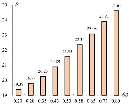 The managers of the production department may set up a larger qδ provided that they consider the decrease in the manufacturing cost owing to the learning effect is more significant. In such a case, the products of premium quality are produced by the assemblers with high working efficiency. The required number of conforming items for inspection can therefore decrease in the presence of a large contraction constant with the aim of minimizing the total cost for the manufacturer. Likewise, Figure 2 shows that changes in the learning rate, which ranges between −60% and 60%, indicate ρ is positively correlated with θδ. It is due to the fact that a higher learning rate induces a lower learning effect. This may lead to a low working efficiency, which entails a higher number of conforming items for inspection to achieve cost minimization. Accordingly, it is suggested that managers should carefully observe the variations in the assemblers’ working efficiency in the manufacturing process to assign adequate values to the contraction constant and learning rate.