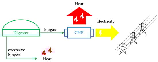 Biogas (being a mixture of 45–74% CH4, mostly with 25–45% CO2) is regarded as a renewable energy source that becomes a highly effective alternative for fossil fuels [,,]. It can be obtained through anaerobic digestion of biomass, landfill gas recovery, sewage sludge, and biomass thermal processing. Similar to other biofuels, biogas has several benefits for the circular economy and sustainability. At first, there is plenty of biomass to be valorized both worldwide and in Europe. According to [], there were 17,783 biogas plants in Europe in 2017, which produced biogas mostly in anaerobic digestion of agricultural residues []. Biodegradable waste, such as, for example, biowaste from households is a valuable source of energy, can be directly valorized into high-quality fuel []. Biogas can be utilized in many different forms, such as fuel for vehicles [,,] or in heat generation. Still, there are other, more economically justified technologies for obtaining heat with other renewables such as wood chips, straw and pellets []. In Europe, most biogas obtained in anaerobic digestors produces electricity, heat or both in combined heat and power (CHP). In 2017, electricity generation from biogas was mostly associated with agricultural feedstock, with the only marginal share of the landfill and sewage biogas []. In Poland, a typical agricultural biogas plant produces biogas and generates heat and electricity in CHP on-site, selling electricity to the electric grid and supplying nearby residential dwellings in heat. This is shown in Figure 1.