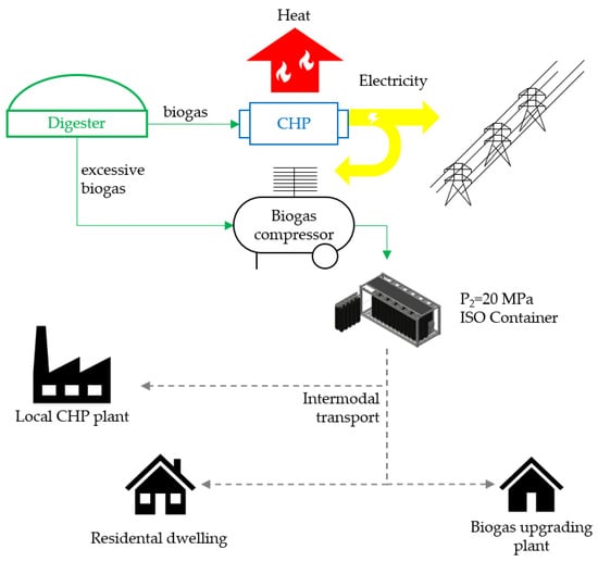 In this work, the authors propose a novel and innovative method to utilize raw agricultural biogas obtained in anaerobic digestion of agricultural waste as a mobile energy source ready to be supplied to remote areas by intermodal transport using modular gas containers. This method involves the production of raw biogas in diverged plants, its compression and distribution to isolated areas having demand for electricity and heat. Compressing biogas directly from the digester eliminates the need for investment in biogas upgrading technologies, making it less expensive to valorize biomass into gaseous fuel. Transport of compressed raw biogas to remote areas could increase the availability of biogas in areas where there is no natural gas grid, increasing the diversity of energy sources and contributing to the effective development of circular economy and sustainable energy systems. The proposed system called compressed biogas distribution system (CBDS) is presented in Figure 2.