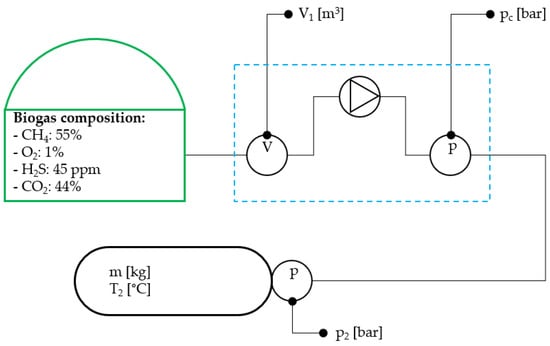 - the volume of biogas measured at the inlet of the compressor was equal to the volume stored in the cylinder; thus, the assumption was made that the volume of gas in piping and cylinders of the compressor is equal before and after compression;