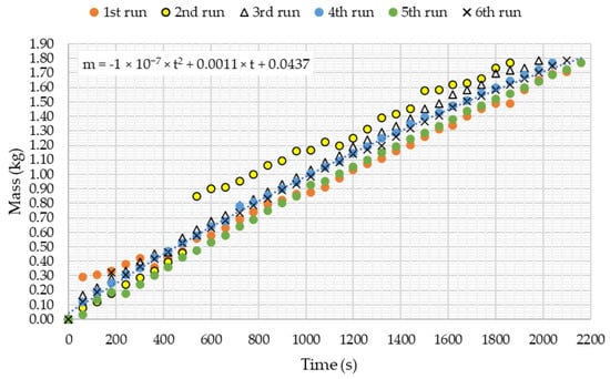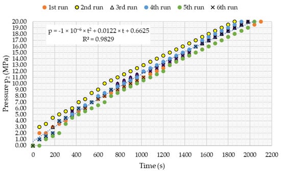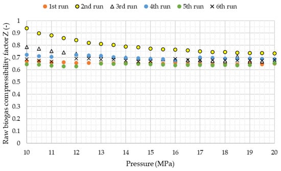 For the results to be comparable within all six test runs, the gas temperature in the compressed state (T2) was measured and used to formulate T(p) dependence, that was further used for all test runs providing, that the obtained function could be assumed to represent measured values of temperature at probability value smaller than 0.05. Such obtained value of temperature, denoted by T2′, was used in Equation (7) together with measured values of p2, p1, T1 and V1 to evaluate the compressibility factor of raw biogas: