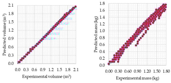 Mean value of the volume of raw biogas stored in the cylinder under a pressure of 20 MPa was equal to 1.97 m3 at a pressure of 20 MPa and temperature of 319.9 K. Assuming that the same pressure and temperature conditions would persist for systems having a bigger capacity for gas storage, it was possible to calculate the volume of raw biogas in transport for Mobile Biogas Station, as described in [,,]. For ISO containers with a water capacity of 14.96 m3, for raw biogas characterized by Z-factor equal to 0.65, based on experimental results of this study, it is possible to estimate that the total volume of transported gas under pressure 20 MPa and temperature of 319.9 K would be equal to 3905.2 m3. Based on the measured value of raw biogas density, this amount of gas would have a mass of 3.751 kg, which is possible to be transported using road, rail and water transport. This value, when predicted by numerical models mentioned in this study, would differ by a maximum of −13.81%. Assuming CHP unit based on research [] (case A), electric energy equal to 6178.5 MJ for CHP unit having 35 kW of power and 7030.7 MJ for CHP unit having 40 kW is possible to be generated. This amount, providing it could be properly stored and distributed, would be enough to power 3 residential dwellings in Poland for a year, assuming annual electricity consumption to be equal to 2003 kWh as published in []. Table 8 summarizes this data.