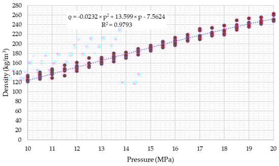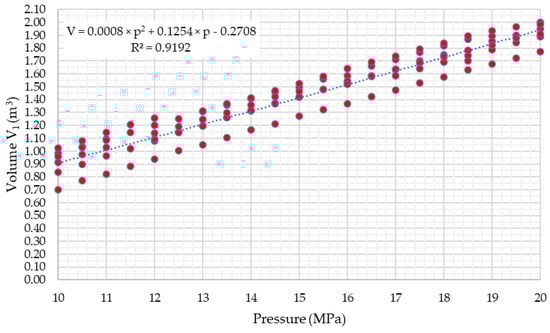 The measured density of raw biogas stored in the pressure vessel was in the range between 121.32 kg/m3 for p2 = 10 MPa, T2 = 313.25 K and 262.50 kg/m3 for p2 = 20 MPa, T2 = 320.15 K. Results are similar to other research for similar gas composition, temperature and pressure range [], where measured values of density of the binary mixture of CH4/CO2 being 60%/40% were in the range between 141.056 kg/m3 for p2 = 9.997 MPa, T2 = 305.18 K and 283.653 kg/m3 for p2 = 17.994 MPa, T2 = 05.24 K. Experimentally determined density of compressed raw biogas makes it possible to estimate the mass of gas being stored in relation to its volume. This is of great importance when designing biogas distribution and storage systems, while this is one of the key parameters affecting materials selection and mechanical design of the system [,,].