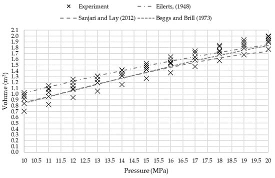 Numerical models used in the study were more effective in the estimation of volume V1 of raw biogas under pressure p2 = 20 MPa than in the entire compression range. Minimum values of ARE% and AARE% were obtained for Eilerts method (ARE = −3.30%, AARE = 4.81%). The mean value of compressed biogas being the result of the experimental study was equal to 1.918 m3. The smallest predicted value was obtained for SRK EoS (1.637 m3), the biggest for Eilert’s method (1.852 m3). However, this value is much different from the value predicted by the ideal gas model, which is reflected in the gas compressibility factor, also called the gas deviation factor. For the mean value of the Z-factor determined experimentally, which was equal to 0.654, the predicted volume of gas stored in a given volume would be 34.5% smaller than the actual volume.