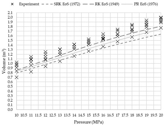 Peng–Robinson (1976) and Soave–Redlich–Kwong (1972) EoS are the most widely used to estimate parameters of compressed gases, including mixtures of CH4 with CO2 [,]. Those equations, along with Redlich–Kwong (1949) EoS, are referred to in terms of the Z-factor as cubic equations of state and are in the form: