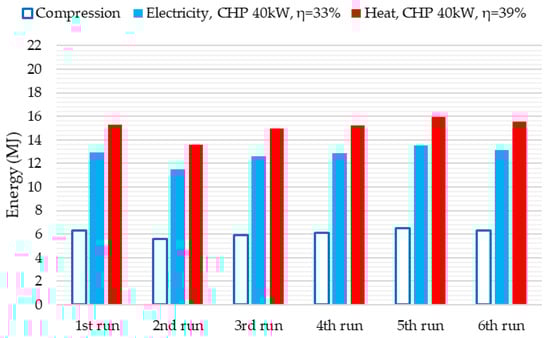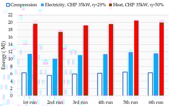 Figure 14 and Figure 15 show the theoretical amount of energy that can be obtained from biogas compressed in each of the 6 test runs for 2 CHP units (35 kW and 45 kW). The mean volume of compressed raw biogas V1 was equal to 1.97 m3. Total energy content in biogas was equal to 38.71 MJ on average. Average compression time tc was equal to 2040 s, during which an average of 6.12 MJ of electric energy was used.