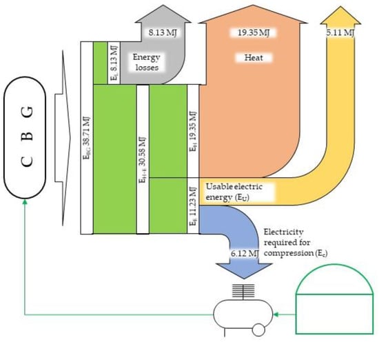 The Sankey diagram for the 35 kW CHP unit is shown in Figure 16. Data presented in the diagram correspond to the average energy content of compressed raw biogas. It was assumed that raw biogas stored in one cylinder of compressed biogas having a water volume of 0.0068 m3 and having a theoretical amount of energy EBG = 38.71 MJ produces 19.35 MJ of heat (EH) and 11.23 MJ of electricity (EE) in CHP. To compress this amount of biogas, 6.12 MJ (Ec) of energy was used. It means, in a closed cycle from 38.71 MJ of the total energy stored in the cylinder (EBG), 24.26 MJ can be used (EH + EU) on-site, providing that 6.12 MJ of electric energy (Ec) is being used for raw biogas compression in parallel to energy generation.