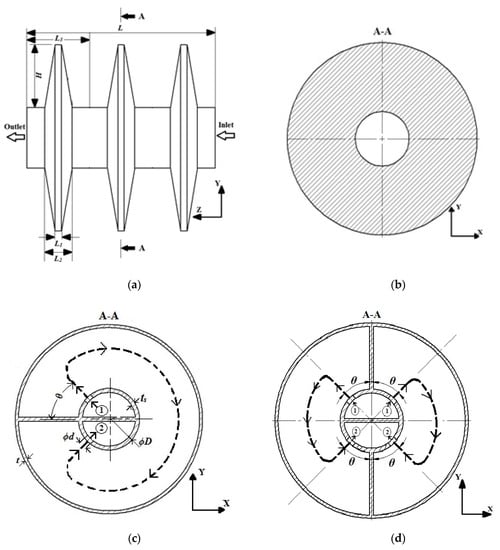 Single-leaf type paddle-shaft components: (a) Outer shape, (b) solid paddle, (c) hollow paddle with two flow holes, and (d) hollow paddle with four flow holes.