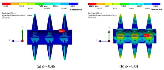 Figure 4 shows the cumulative von Mises stress distribution indicator for two designs with ϕ = 0.46 and 0.04, respectively. The steeper ψ curve with ϕ = 0.46 means more uniform stress distribution. From Figure 4, we also see that the volume of the high-stress region (e.g., σ > 50 MPa) with ϕ = 0.46 is less than that with ϕ = 0.04. Both the local stress performance (σmax) and the overall stress performance (ψ) are improved.