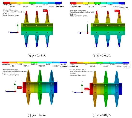 Figure 5 shows the directional deformations of the paddle designs with ϕ = 0.46 and 0.04. Basically, there is small difference in both the directional deformations for the two designs. That is because the deformations depend on the overall temperature gradient and the original size of the paddles. The overall temperature gradient does not differ very much. Different from δy and δZ, the maximum stress σmax is affected by the local temperature gradient, not an overall feature.