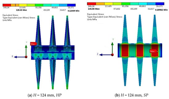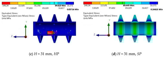 Figure 6 shows the corresponding stress distribution for the designs with two paddle heights for HP and SP. It is obvious that the stress distribution for HP is more uniform than that for SP for the two paddle heights. For HP, when H = 124 mm in Figure 6a, the maximum stress is located near one inlet flow hole, and when H = 31 mm in Figure 6c, the maximum stress is located near one outlet flow hole. Clearly, the distribution in Figure 6c is more uniform than that in Figure 6a. The observation reminds us that the region near the flow holes is the most dangerous from the viewpoint of stress (i.e., stress concentration). For SP in Figure 6b,d, high stress occurs at the center regions that correspond to the paddles’ bases, e.g., the red parts in Figure 6b. In Figure 6d, the maximum stress is not located in this cross-section, which is therefore not shown.