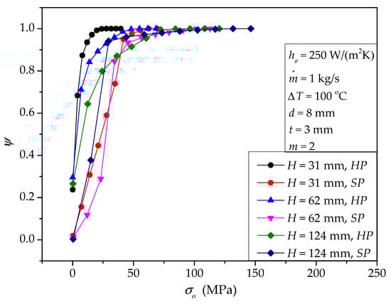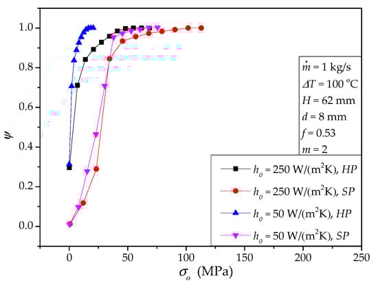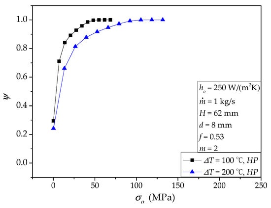 Usually, the temperature difference between the molten salt inlet temperature (Ti) and the material temperature (To) is fixed by users or designers. If it is changeable, we can use the same method presented in Section 4.1 and Section 4.2 to evaluate its effects. Since the properties of the molten salt are assumed constant, ΔP is independent of ΔT. Theoretically, in general, for normal solid structures, larger ΔT will produce higher heat transfer rate, thermal stress, and deformation. Here, we only provide an example for HP to emphasize this common knowledge, shown in Table 10. According to Table 10, both and σmax are significantly larger for ΔT = 200 °C than that for ΔT = 100 °C. The deformations δy and δz also increase with the increase of ΔT. Figure 12 summarizes the cumulative von Mises stress distribution for the temperature difference effect. Obviously, the ψ curve for smaller ΔT is steeper. Actually, a larger temperature difference proposes a more serious challenge in both σmax (local feature) and stress uniformity (overall feature).