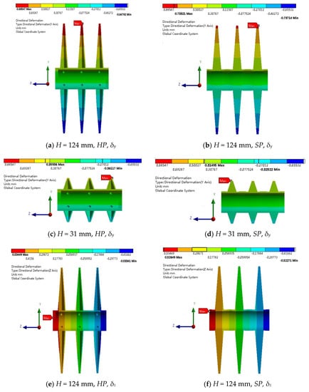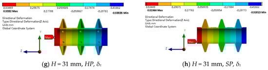 Figure 8 shows the directional deformations for the designs with two different paddle heights. For the three paddles of one paddle-shaft component, the δy distribution is nearly the same for either HP or SP, but the δz distribution is different from the right (dead end) to left (free end). Larger paddle height affects δy significantly, but does not affect the distribution features of both δy and δz. For industry-scale components with large paddle height and long shaft, both δy and δz are important.