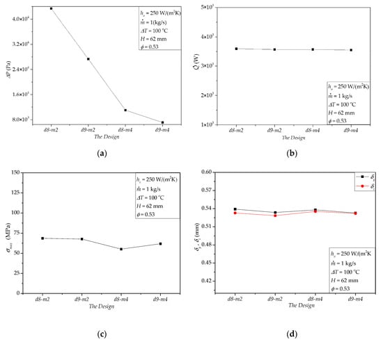Figure 9 shows the effects of the diameter (d) and number (m) of the flow holes, where d8-m2 represents d = 8 mm and m = 2. Similarly, d8-m4, d9-m2 and d9-m4 represent (d = 8 mm, m = 4), (d = 9 mm, m = 2), and (d = 9 mm, m = 4), respectively. It can be seen that from Figure 9a, ΔP drops rapidly with the increase of d and m. According to Figure 9b, there is a little effect on when d and m change. This attributes to the constant mass flow rate and heat transfer area. Figure 9c,d show that the effects of d and m on the thermal stress and corresponding deformations are weak. Here, we should remind that the above observation only holds for the specified conditions in this paper. As a general principle of mechanical design, more holes will influence the mechanical strength of a shaft. As a consequence, increasing m and d here has a significant advantage in decreasing ΔP, i.e., reducing the pumping power for driving the molten salt flow.