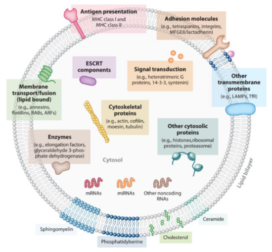 Due to their composition (see Figure 1), exosomes act as nanocarriers in the transfer of macromolecules around the organism. They play a fundamental role as mediators in cell to cell communication, whether cells are close to or far from each other [10,35]. These nanosystems are capable of eliciting biological responses like expression/suppression of proteins, induce immune responses, or modulate cancer progression [24,40].