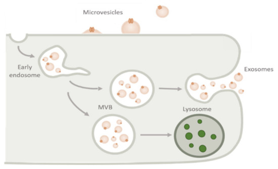 As previously mentioned, exosomes are considered extracellular vesicles with an endocytic origin [15]. When a cell membrane site is invaginated through the ubiquitination of surface receptors, it leads to the formation of early endosomes [16]. As they mature, there is a gradual increase in size and change in their content, mostly due to the accumulation of intraluminal vesicles (ILV). They eventually become late endosomes, also referred to as MVBs [17,41]. After their maturation, MVBs usually fuse with lysosomes, and their contents suffer lysosomal degradation. However, by a process that still is not quite understood, the membrane of MVBs can fuse with the PM of the cell, leading to the release of the accumulated ILVs, which are now called exosomes (see Figure 2) [17,24,41,42].