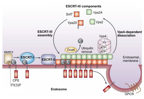The ESCRT proteins in Saccharomyces cerevisiae yeast and corresponding human analogue [42,44].