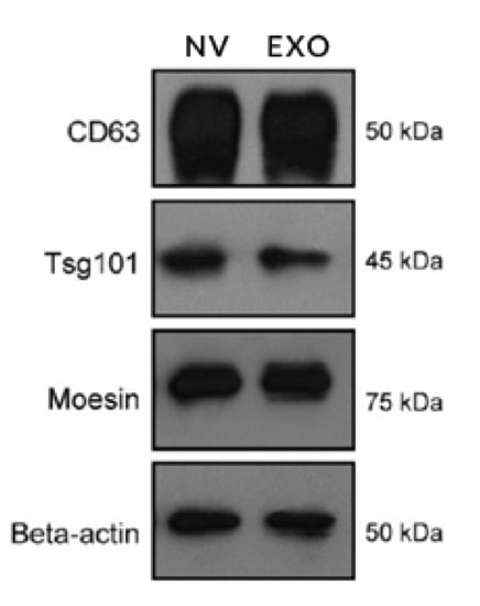 Western blot results comparison between the nanovesicles (NV) and exosomes (EXO) [57].