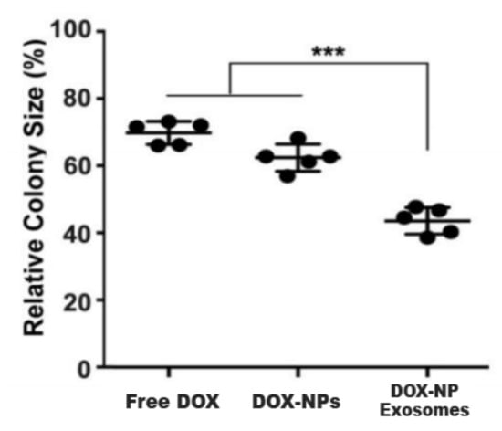 In the same study, mice were transplanted with CT26 cells (a colorectal carcinoma cell line that causes tumours when introduced in mice). After tumour growth was observed, exosome-like nanovesicles loaded with DOX were administered. Tumour reduction could be observed and there was no reported decrease in body weight and white cells count. In addition to these promising results in terms of therapeutic efficacy, the yield of the exosome-like particles was about 100-fold higher than the quantity of naturally released exosomes [57]. Hence, the method used to obtain exosome mimics is a great alternative to study the effects of these particles as drug delivery systems.