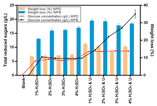 Figure 2. Effect of acid pretreatment alone and in combination with ultrasonic on weight loss and total reduced sugars of waste paper deinked (WPD) and waste paper blank (WPB).