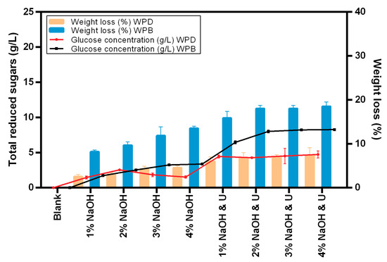 Figure 3. Effect of alkaline pretreatment on weight loss and the glucose concentration of WPD and WPB paper.