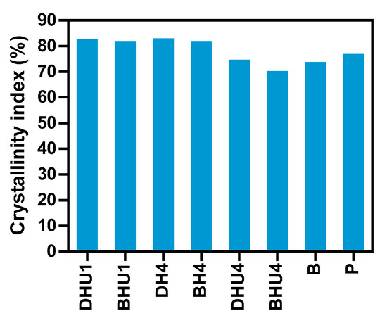 Figure 4. The effect of acid pretreatment on the crystallinity index. DHU1: WPD pretreated with 1% sulfuric acid and ultrasonic. BHU1: WPB pretreated with 1% sulfuric acid and ultrasonic; DH4: WPD pretreated with 4% sulfuric acid; BH4: WPB pretreated with 4% sulfuric acid; DHU4: WPD pretreated with 4% sulfuric acid and ultrasonic; BHU4: WPB pretreated with 4% sulfuric acid and ultrasonic; B: WPB; P: sample of worn banknotes.