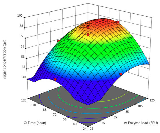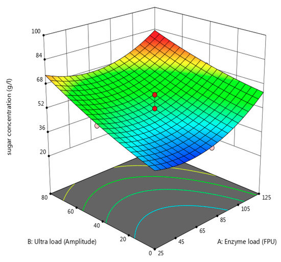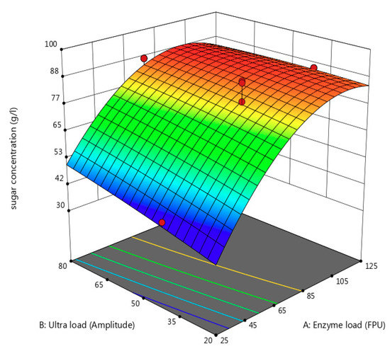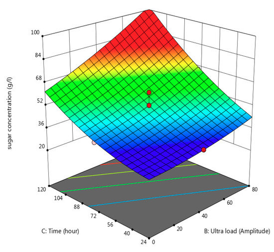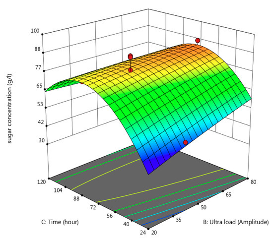 In Figure 10, the effect of ultrasonic and enzyme loadings on TRS production is presented. It is evident that enzyme loading had a significant effect on TRS production up to 80 FPU/mL. The effect of the enzyme loading on the process was far greater than ultrasonic loading. In order to optimize the process by using the response level method, a three-factor Box–Behnken design was applied. The best achievable TRS was with the ultrasonic loading of 74, the enzyme loading of 101 FPU/mL, and the contact time of 75 h. The software prediction was 88.8 g/L according to the conditions, which after measuring the amount of sugar according to the DNS method and the standard glucose chart, the actual amount of obtained sugar was equal to 92 g/L.
