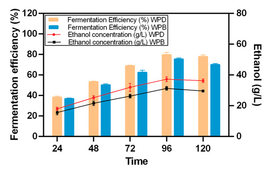 In order to ferment the liquid obtained from the hydrolysis of WPD and WPB samples, the yeast Scheffersomyces stipitis was used at 8% loading for 96 h at 32 °C. The results of the fermentation efficiency and ethanol concentration are shown in Figure 11. The fermentation efficiency was lower for samples fermented for 24 h (between 36.8% and 38.3%), and higher for samples fermented for 96 h (between 75.5% and 79.7%). Bioethanol production was also lower for samples pretreated for 24 h, ranging between 15.6 g/L and 18.0g/L, and higher for samples pretreated for 96 h (between 31.3 g/L and 37.3 g/L). Overall, the amount of bioethanol produced from WPD was far greater than WPB. Ethanol was produced from WPD at 38 g/L and from WPB at 31 g/L, i.e., the deinking caused the improvement in the ethanol production by 19.5%. Statistically significant differences were found between the fermentation efficiency of WPD and ethanol concentration of WPD (p < 0.05) and the fermentation efficiency of WPD and ethanol concentration of WPB (p < 0.01).