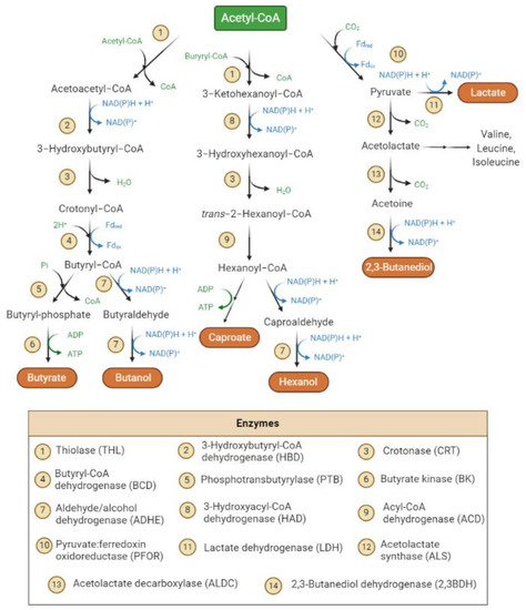 | C. ljungdahlii | − | 6.0 | 37 °C | CO, CO2, H2 | Fructose, glucose, xylose, arabinose, triose, erythrose, fumarate, formic acid, ethanol, and pyruvate | Acetate, EtOH, 2,3-butanediol, lactate | [82,97] |